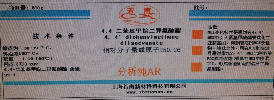 4,4-二苯基甲烷二异氰酸酯 MDI液化技术是通过在4,4′-MDI中引入氨基甲酸酯或碳化二亚胺基团,得到液态的MDI改性物。除此之外,可在MDI制造过程通过增加2,4′-MDI比例而使MDI成为液态(或者在MDI中掺混TDI,形成低凝固点的混合二异氰酸酯。 |